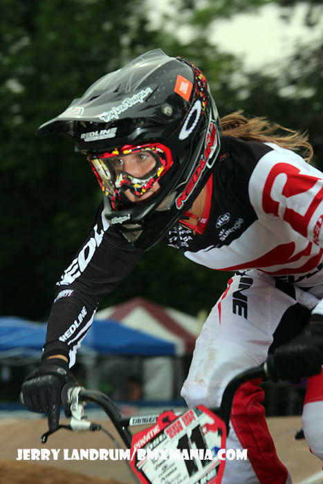 From left, it's Brooke Crain, Alise Post, Dominique Daniels and Sarah Walker......Some VERY serious Lady Pro Speed, Grace and Power makin' it's way down the first straight at legendary Rockford BMX! Alise held her lead for the win and did it twice over the weekend, taking yet another Double for her 2013 collection of wins. |