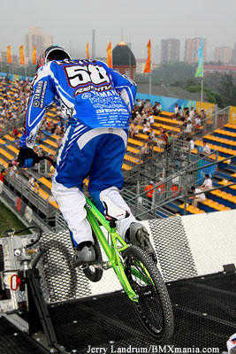 | Team USA's, Steven Cisar, getting his start dialed in at the 2007 UCI BMX Supercross race on the Olympic BMX Track in Beijing, China. 30 feet off the ground, gettin' ready to indulge in some serious SPEED going down the massive start hill, this is INTENSE BMX race action! |