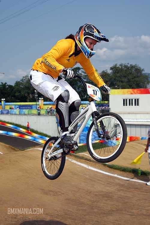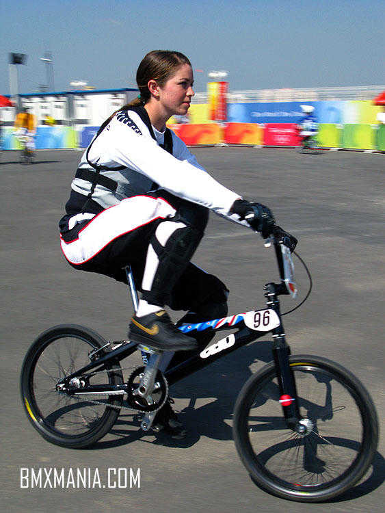 In the main, the eight fastest women in the World lined up for tens of millions of TV viewers to see what BMX is all about. From the start, Shanaze and rival Anne-Caro were straight to the front of the hard-chargin’ pack. Over the first jump, Canadian Samantha Cools looped and bailed in spectacular fashion.